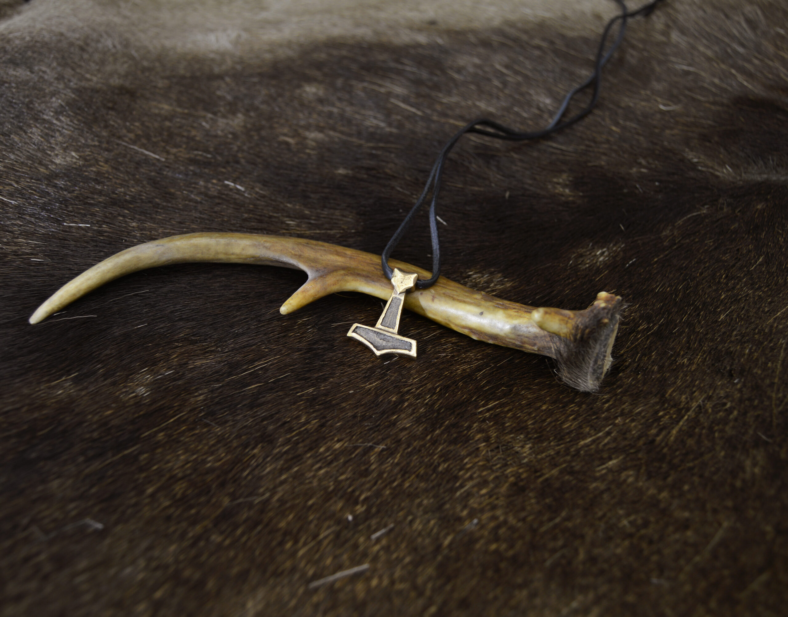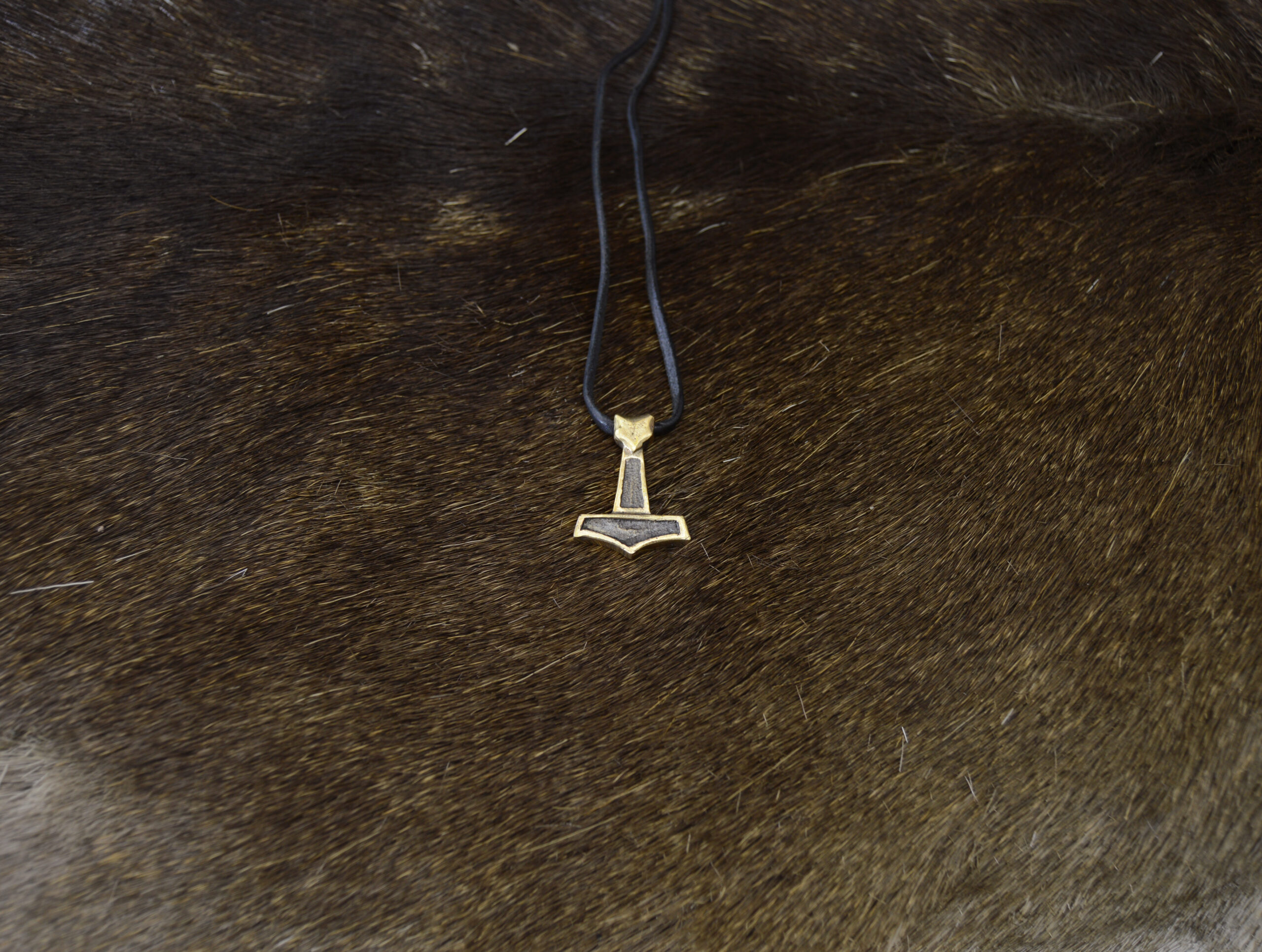 Tämä Mjölnir on valmistettu valupronssista. Sen mukana tulee kotimaisesta hirvennahasta valmistettu nahkanyöri jossa riipus pysyy tyylikkäästi.